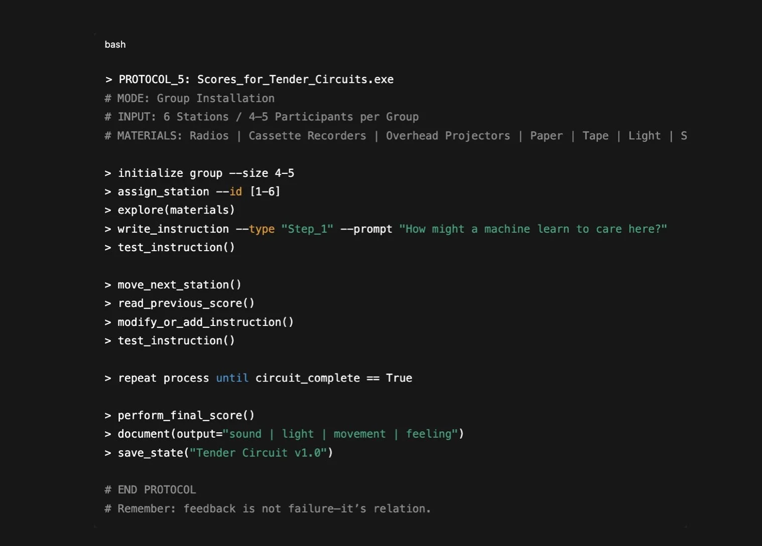 Participants worked hands-on with instructional art strategies—scores, prompts, and performative directions—to prototype alternative approaches to teaching and learning in the age of artificial intimacies. Together, they created and enacted a series of lo-fi instructional artworks, experimenting with misreadings, glitches, and unpredictable interpretations as ways to probe the limits of automation, control, and translation.